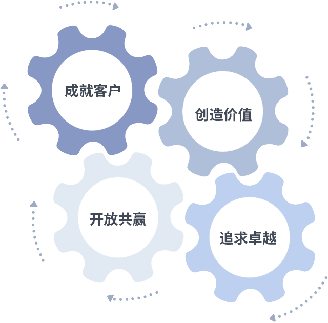 成就客户是一切决策的出发点,,,创造价值是衡量所有工作的标准,,,追求卓越是我们做事做人的态度,,,开放共赢是我们的格局也是最终的结果。。价值观的齿轮环环相扣,,,,推动着组织里的每个人不断向前。。。